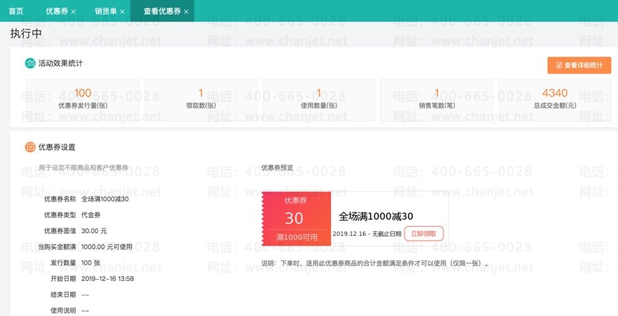 进入活动详情页,可以查看活动的状态、效果统计和优惠券详情,右上角可以查看详细统计