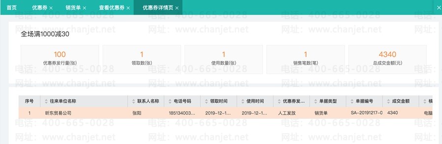 按客户统计:领取时间、使用时间、优惠券发放方式、使用的单据类型、单据号、成交金额