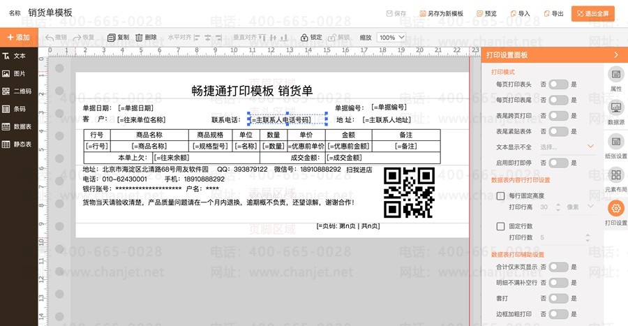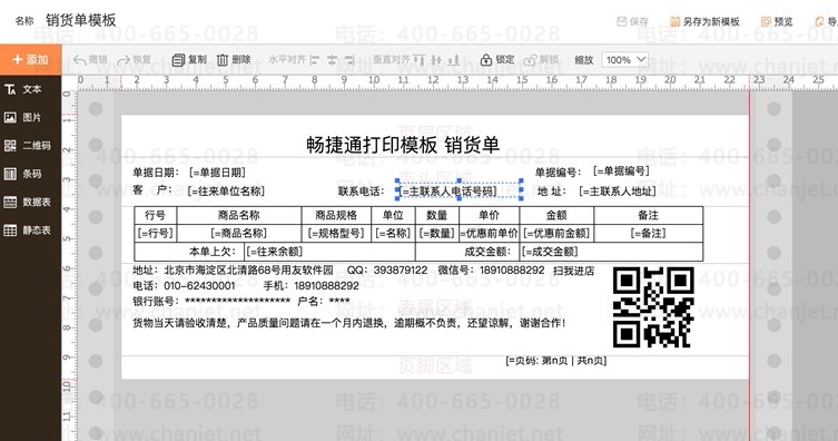 以销货单打印模板为例,系统预置一张模板,可以在此基础上修改