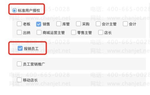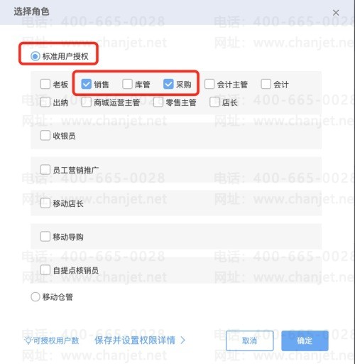 员工小王,在授权登录时,勾选【标准用户授权】同时勾选员工需要的角色,如【销售】【采购】。则只扣减【标准用户数】。