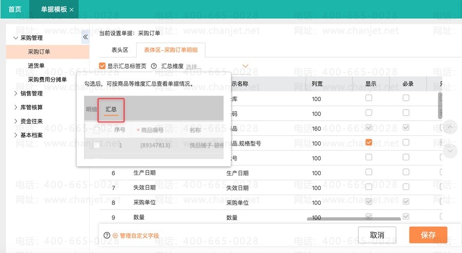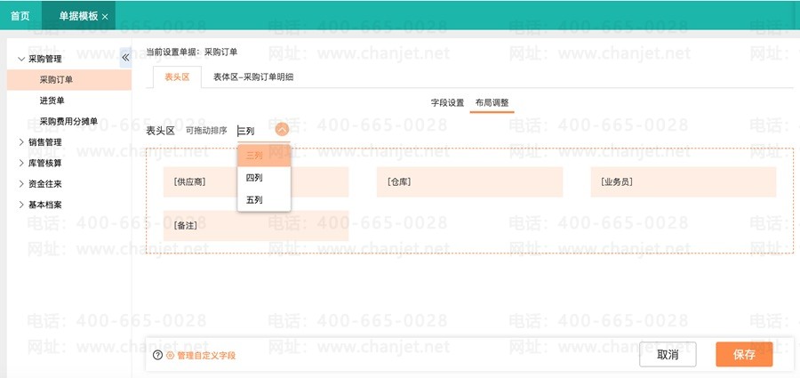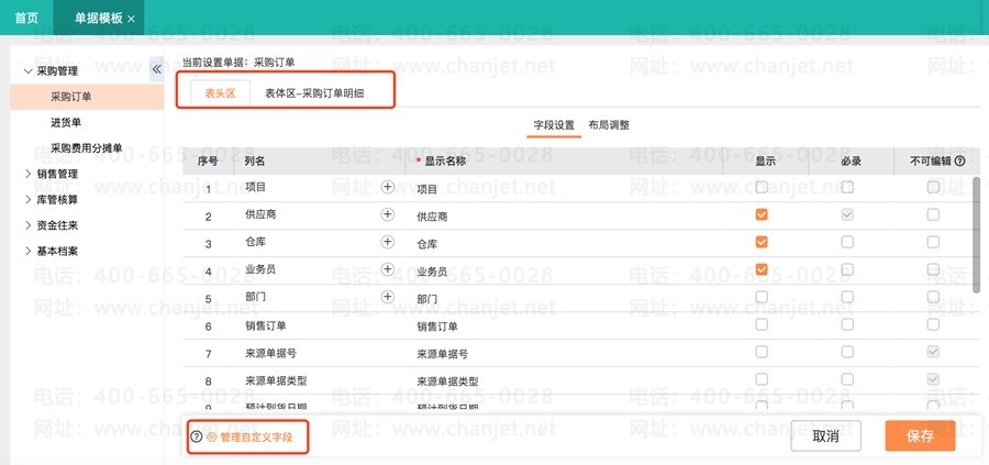 1、支持设置单据表头、表体字段,是否显示、是否必录、是否可以编辑