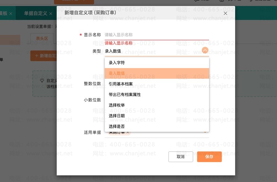 (1)字段类型包括:字符、数值、引用基本档案、带出已有档案属性、枚举、日期等;