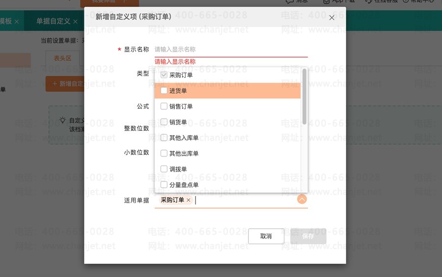 新增字段时,选择适用单据,勾选多个单据即为公共自定义字段