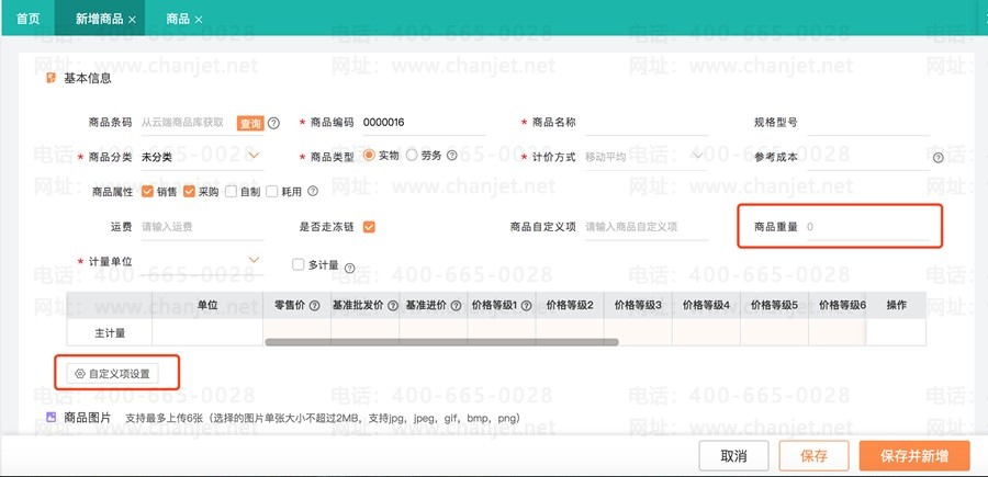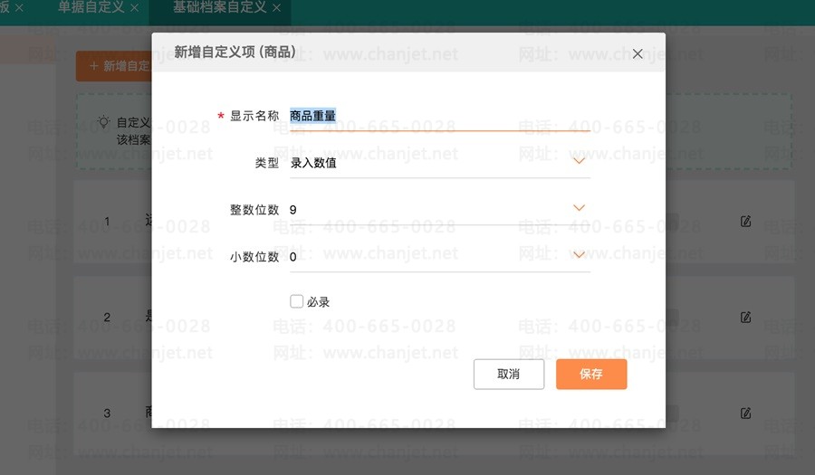 1、新增【商品重量】字段,类型为数值型,允许设置整数和小数位数,选择在商品档案中是否必录;
