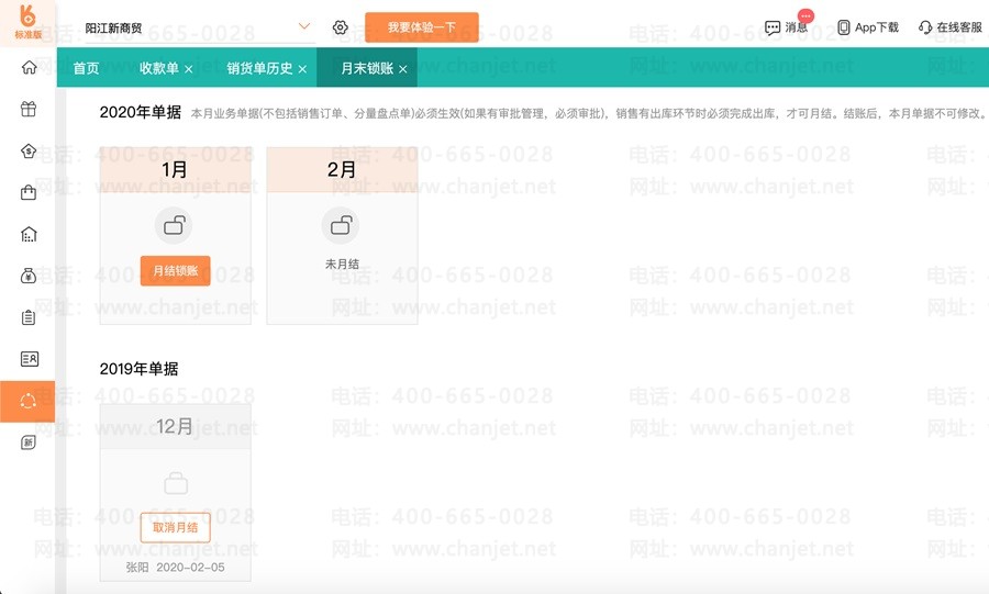 3、月结锁账系统会检查本月业务单据(不包括销售订单、分量盘点单)必须生效(如果有审批管理,必须审批),销售有出库环节时必须完成出库,才可月结。结账后,本月单据不可修改。