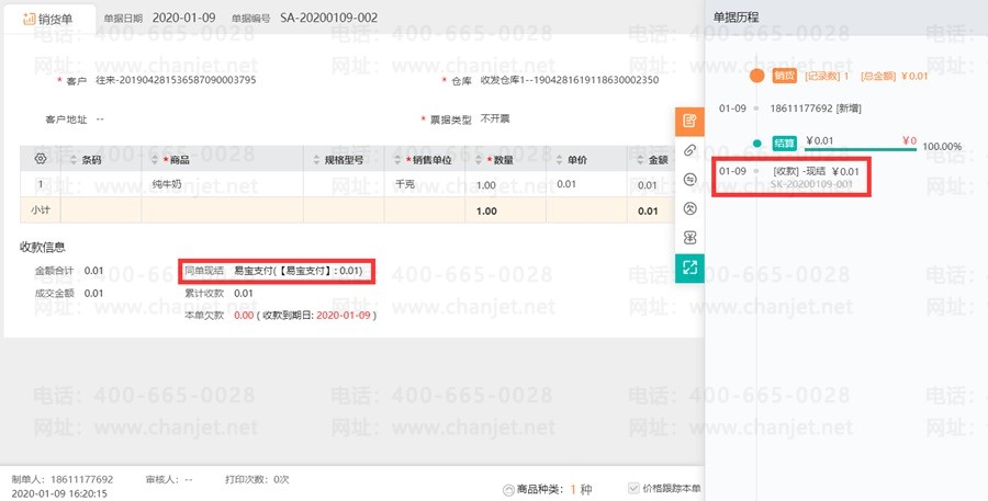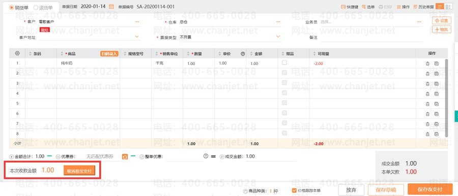 1、新增销货单,支付方式选择【易宝支付】