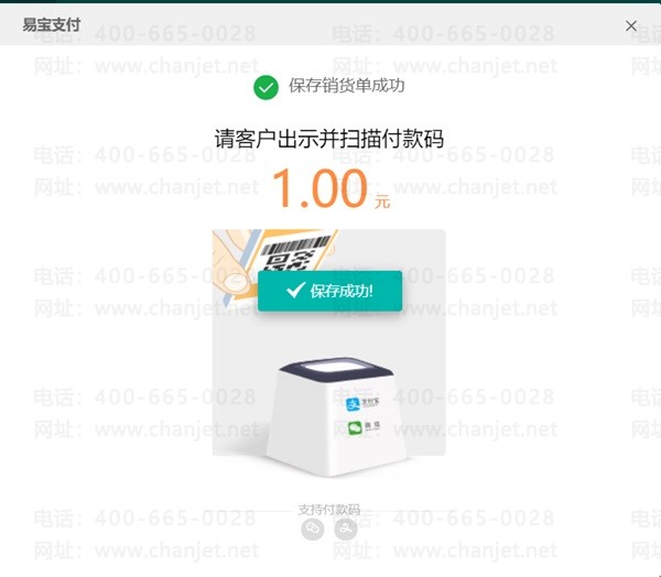 2、保存并支付后,系统弹出如下界面,这时可以在POS机刷客户的动态二维码收款。可以是微信的,也可以是支付宝的。