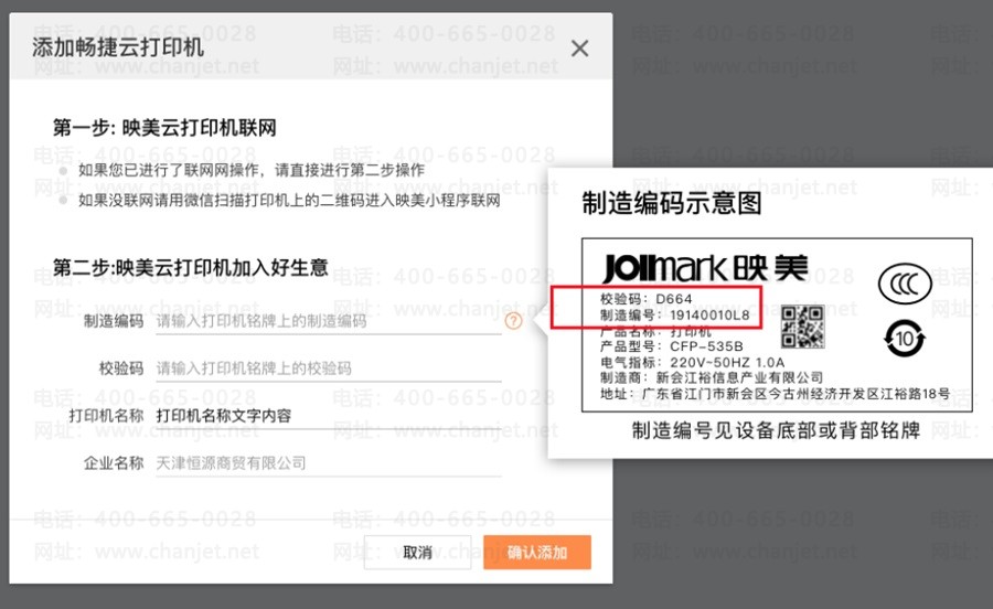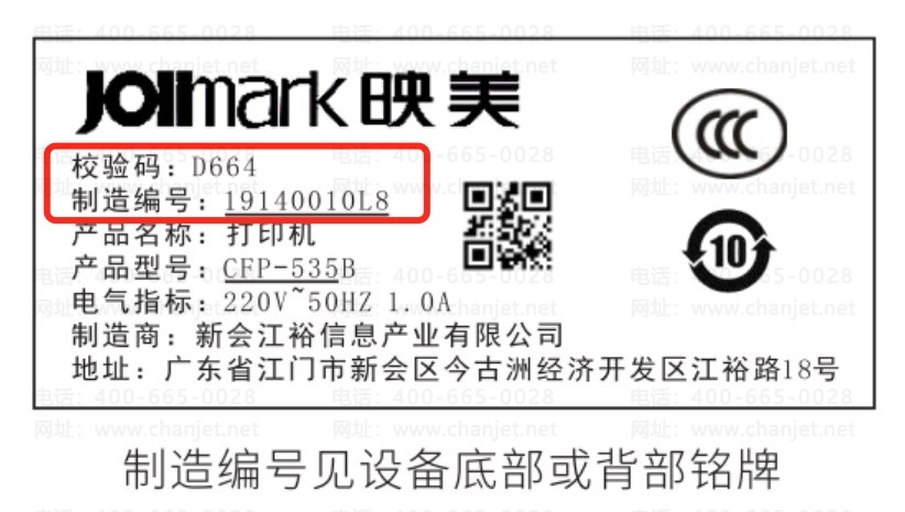 其中【校验码】【制造编号】支持扫描打印机机身上标签中二维码填写。也可直接在手机端扫描标签中二维码,自动添加(标签如下图所示)