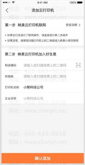 1、打印机网络设置成功后,在好生意/好业财移动端【我的】-【打印机管理】或web端【系统管理】-【打印设置】-【打印机管理】页面中,点击【添加畅捷云打印机】,填写打印机信息,添加打印机。 需要填写的内容为:制造编码、校验码、打印机名称、企业名称(系统会自动带出,不需手工填写)