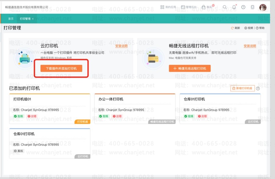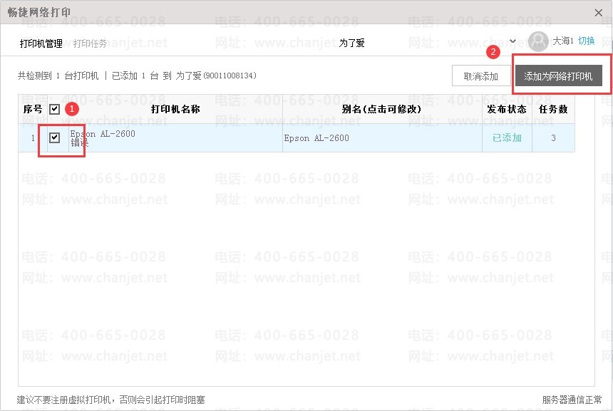 4、在打印插件上选择识别出来的打印机,点击右上的【添加为网络打印机】