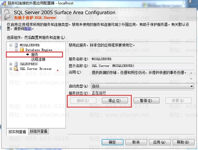 (3)应用后,选择MSSQLSERVER/Database Engine/服务,停止服务,再重新启用服务,使调整生效