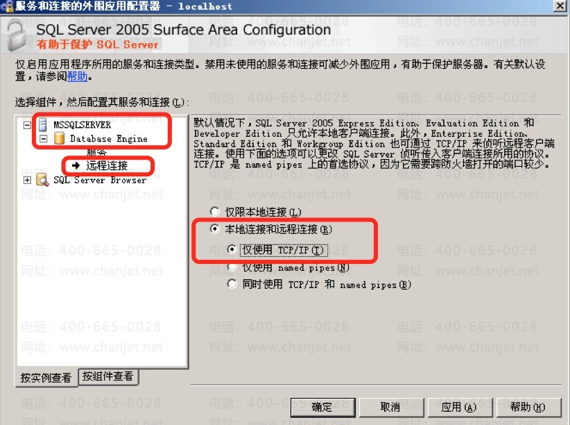 (2)选择MSSQLSERVER/Database Engine/远程连接,修改为“本地连接和远程连接(R)/仅使用TCP/IP(T)”,点击【应用】按钮