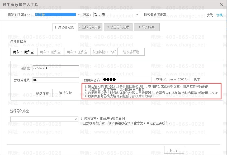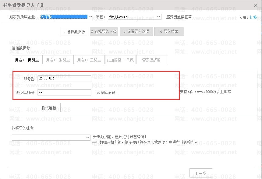 (2)第二步:检查T1或管家婆套接字服务器端填写的服务器名称、用户名、密码是否和T1导入工具中的帐号信息相同。
