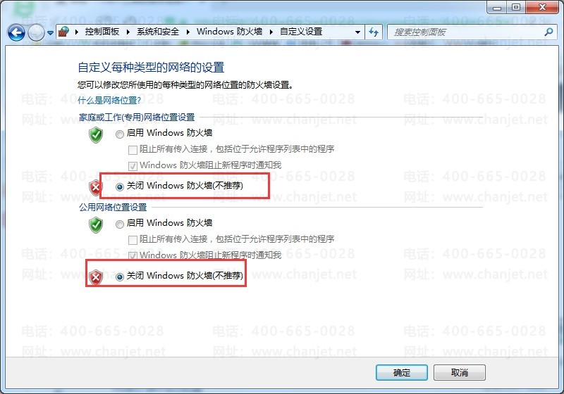 (5)在防火墙的自定义页面,将【家庭或工作(专用)网络位置设置】【公共网络位置设置】中的选项,设置为【关闭】