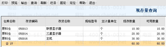 现在仓库库存情况:联想显示器 10、三星显示器 20、主机 30