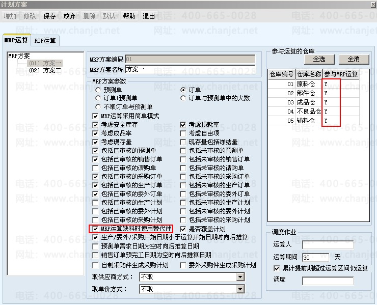 2. 生产管理参数设置中选择‘MRP运算缺料时使用替代件’