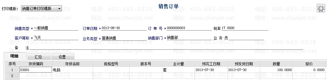 1、当企业接到一张100台电脑的销售订单时,填制销售订单,审核;
