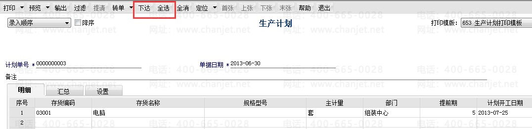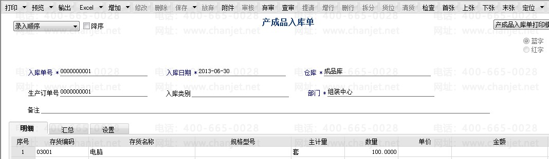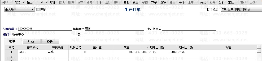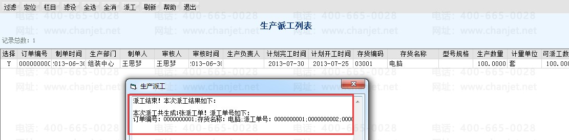 6、生产计划下达后自动生成一张100套电脑的生产订单,生产订单审核;