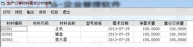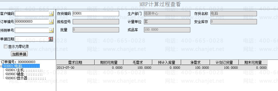 查看MRP运算过程,计算出电脑的净需求是100套;