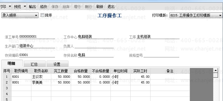 生产进度汇报中录入完工数量(合格品数量和不合格品数量),以及各工人的完工数量及工时;