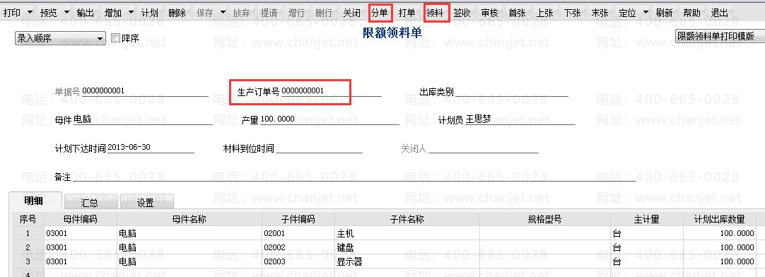 11、库存模块做限额领料单,录入生成订单号生成限额领料单;限额领料单张领料、分单生成材料出库单;审核;