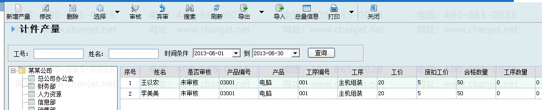 2、产量导入后查看计件产量中,显示各人员的合格数量和工价,审核;’
