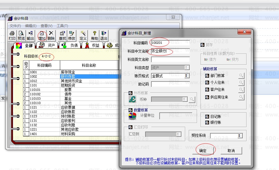 4.完善会计科目(点增加,注意科目编码按规则录入——录入科目名称——确定)