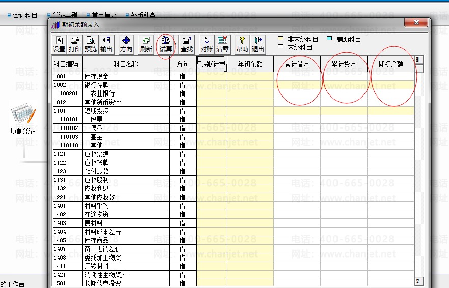 7录入期初余额——累计借方——累计贷方——录完一号要进行试算