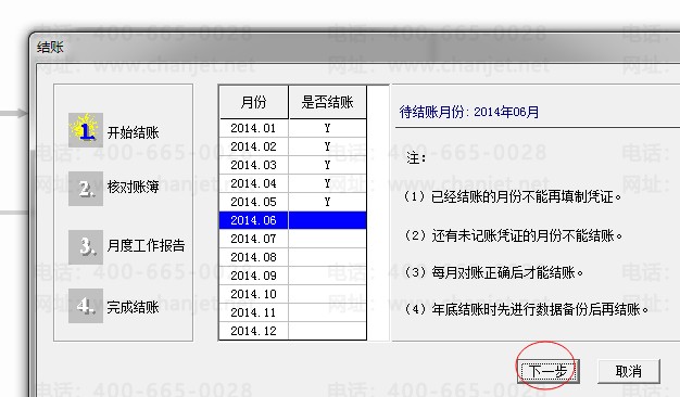 当我们一个月的凭证操作完以后就可以进行月结(联系点击下一步即可)