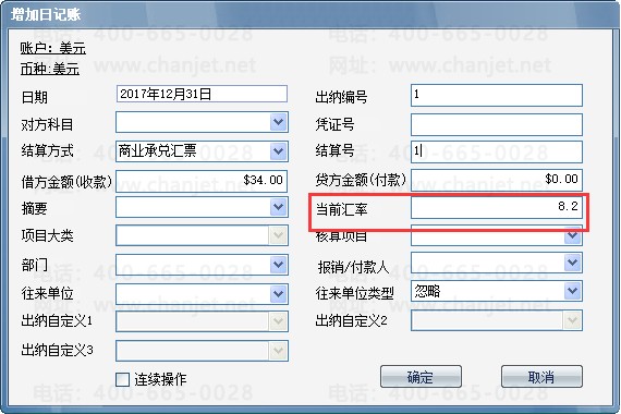 添加美元日记账时,可录入日记账当前汇率,软件自动换算出本币金额;