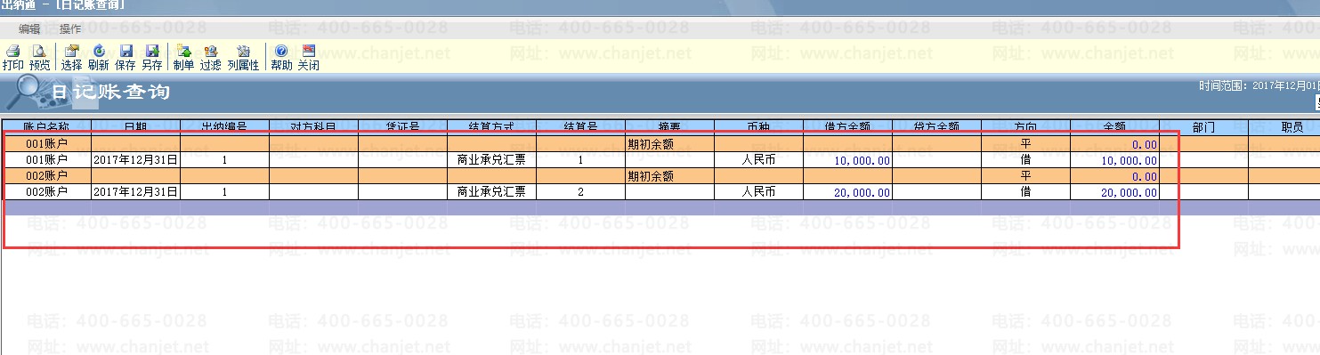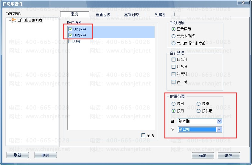 由于需要合并制单的日记账是 001 和 002 账户 12 月份的两条日记账记录,所以在做日记账查询方案时,账户选中 001 和 002 账户,查询期间选择第 12 期即可;