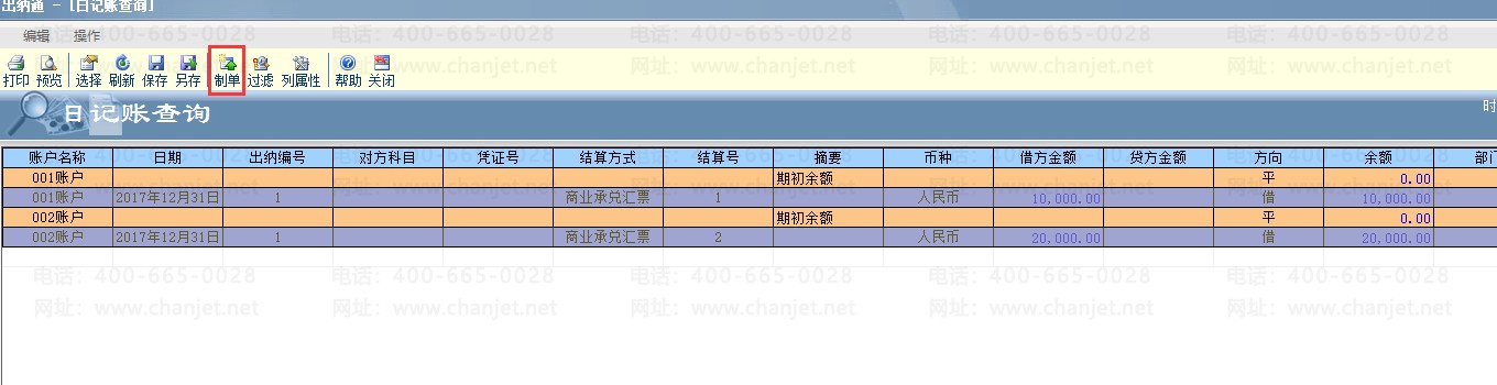 由于出纳管理中日记账制单需要选择某个账户登录后才能点击“制单”,如果两个不同账户的日记账需要合并制单,无法同时选中两条记录。则需要到日记账查询界面,才能同时选中多条记录进行制单。