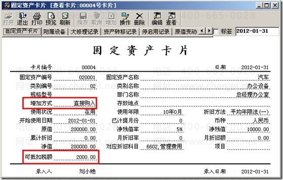 (2)点击“资产增加”增加一张固定资产卡片,在新增卡片录入界面一定要录入在选项里设置的固定资产增加方式,以及可抵扣税额,录完后点击保存。