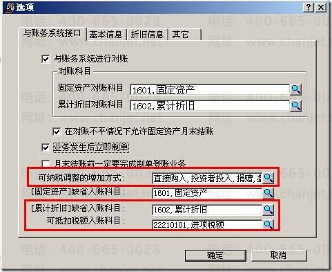 (1)在“固定资产”模块,点击“固定资产”—“设置”-“选项”-“与账务系统接口”,在“可纳税调整的增加方式”一栏里点击旁边的放大镜选择固定资产的增加方式,在“可抵扣税额入账科目”里再点击旁边的放大镜选择“进项税额”科目。