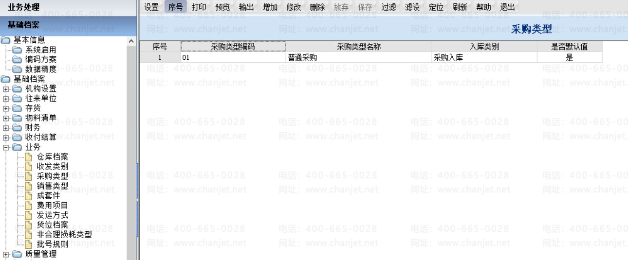 其中采购类型是在基础档案→业务→采购类型里面添加的。业务类型默认为与采购类型相同