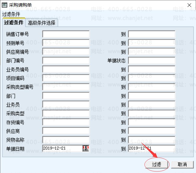 请购单下面是请购单列表,点击之后会跳出来采购请购单条件过滤单。添加过滤条件,点击过滤就会跳出页面显示一共有几张请购单