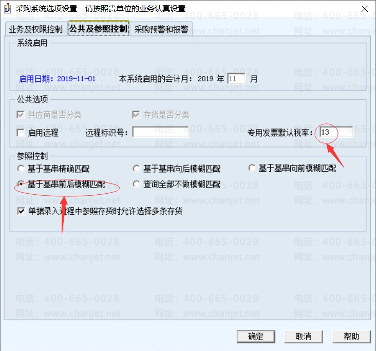 点击采购系统选项设置,点击表头上面的公共及参照设置,选择基于基串前后模糊匹配,其中专用发票默认税率改为13,最后点确定。
