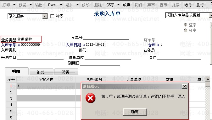 采购业务类型为普通采购时,采购到货单只能参照采购订单生成,不能手工输入,采购入库单只能参照采购订单或采购到货单生成,手工输入时会提示