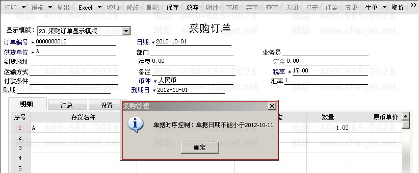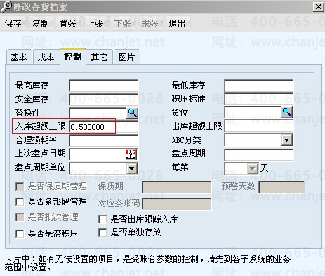 2、允许超订单到货及入库时,须在存货档案中控制页签输入‘入库超额上限’(此中录入超额量与订单量的比例,不录时默认比例为0)