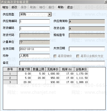 2、 若为取自供应商存货价格表价格,则单据会自动带入供应商存货价格表中的价格,但此前须填写供应商存货价格表