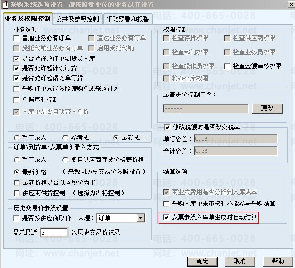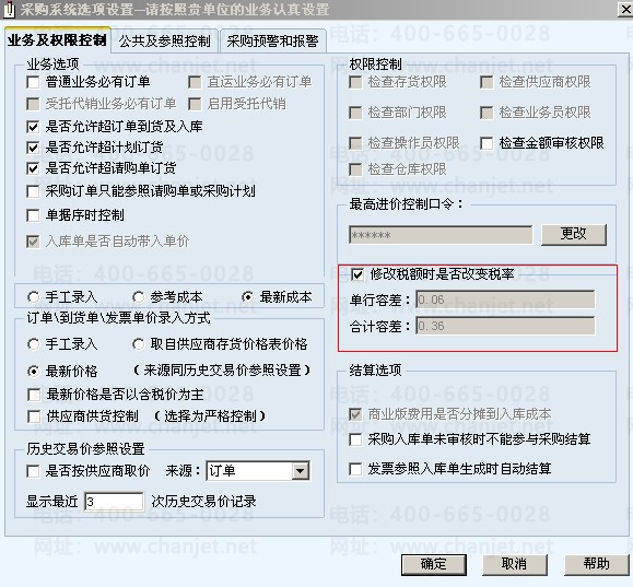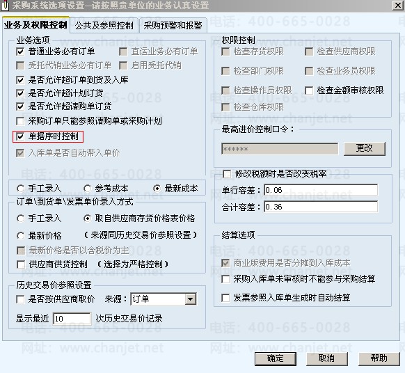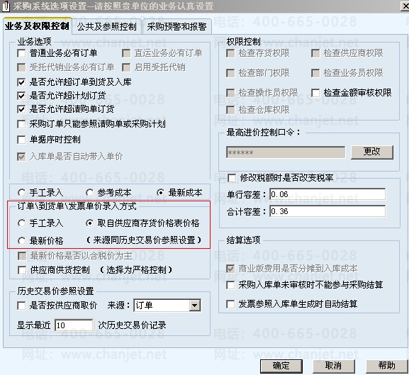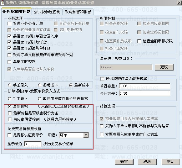 3、若为最新价格,可设置历史交易价格参照是否按供应商取价,取价可来源于订单、到货单及发票(现选择订单),且可选择最近历史交易价记录(现选择3次)