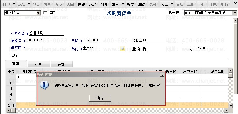 若到货单或入库单超额量大于入库超额上限,则会提示
