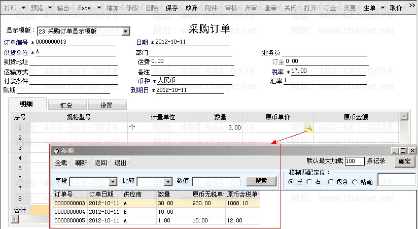 填制单据时点击单价栏放大镜可参照最近3次采购订单中的历史价格