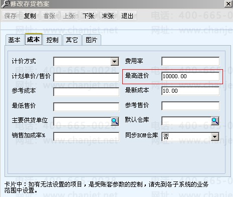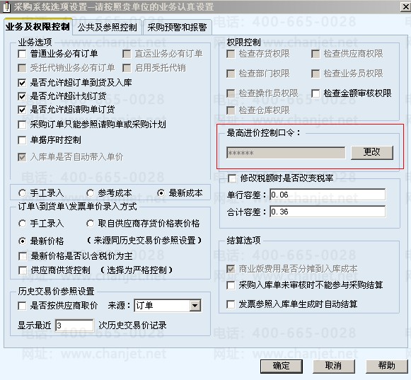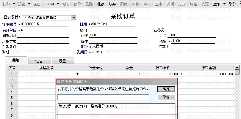 若单据中价格高于最高进价则单据保存时会提示输入口令
