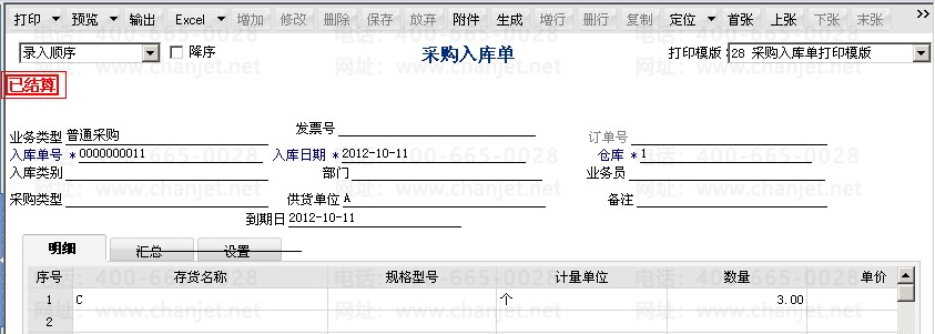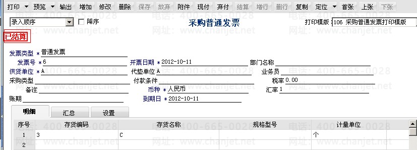 参照采购入库单生成的发票保存后,单据自动打上已结算的标志