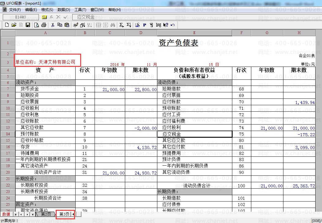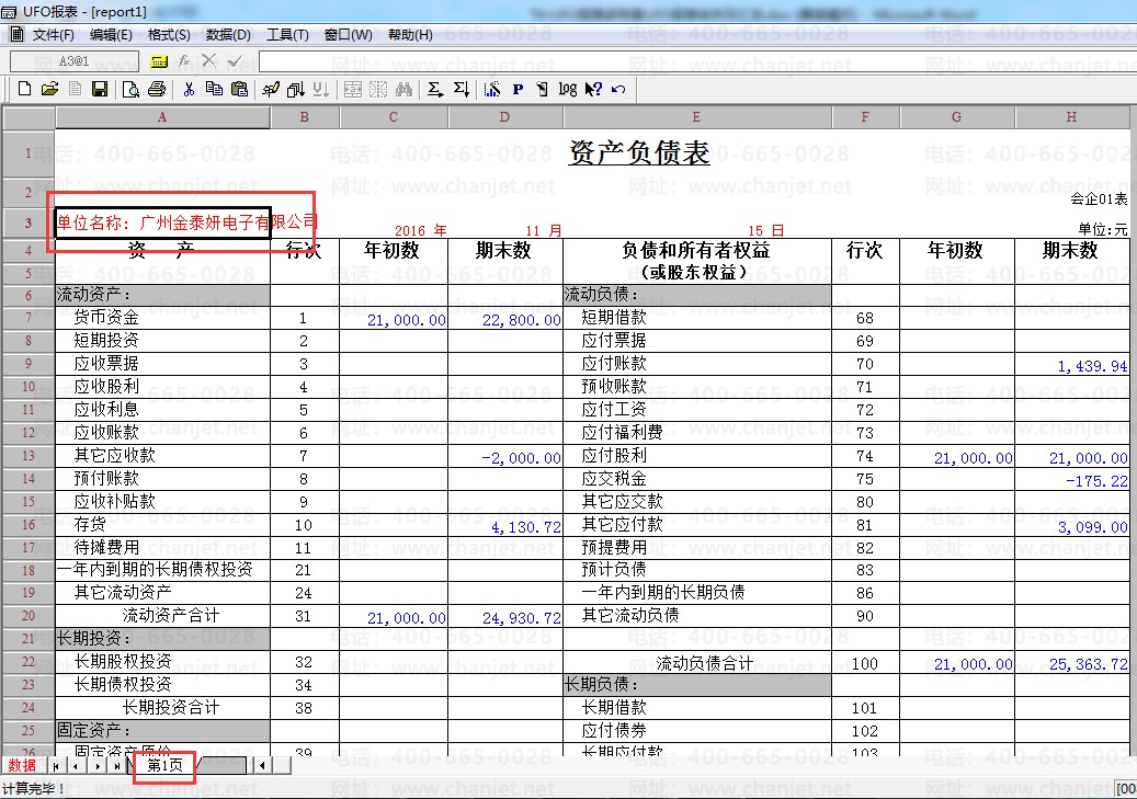 在“第1页”得到第一个账套的资产负债表