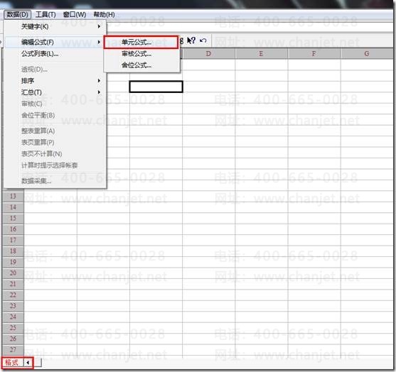 新建一个报表文件,报表状态为“格式”状态,点击“数据”菜单下的“编辑公式”->单元公式