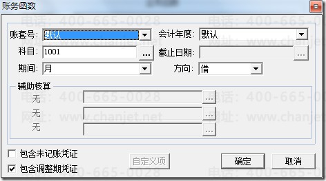 3、根据实际情况选择账套号、会计年度、科目、期间、方向等信息,设置完成后点击“确定”按钮