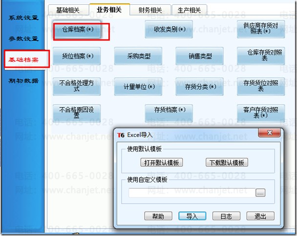 编辑完成后,在初始化导航中,右击‘仓库档案’选择‘Excel导入’,点击‘使用自定义模板’右侧按钮,选择刚才保存好的Excel文档,再点击“导入”按钮,导入成功后会提示: