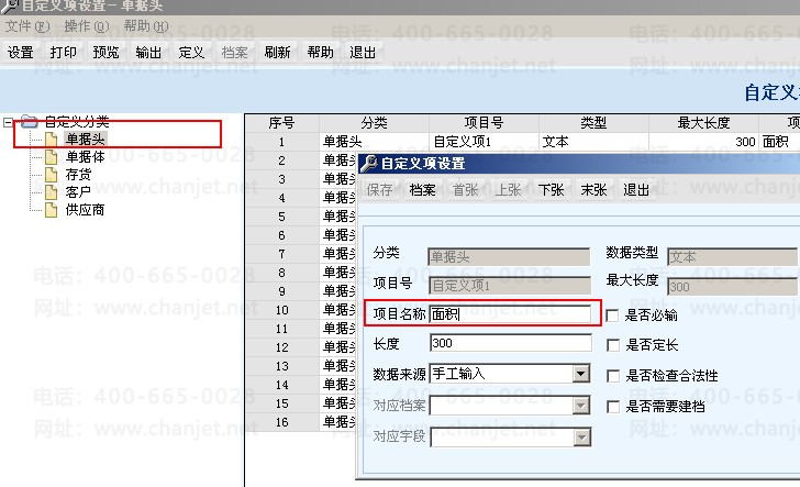 1. 设置科目自定义项目档案,在基础档案--其它--自定义项设置--单据,如启用单据头自定义项1—面积。